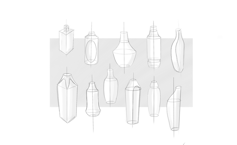 These sketches explore bottles with flat sides so that they can be stacked next to each other, removing any wasted space. We also are exploring alternative materials the bottles can be made out of that would make the bottles less breakable.